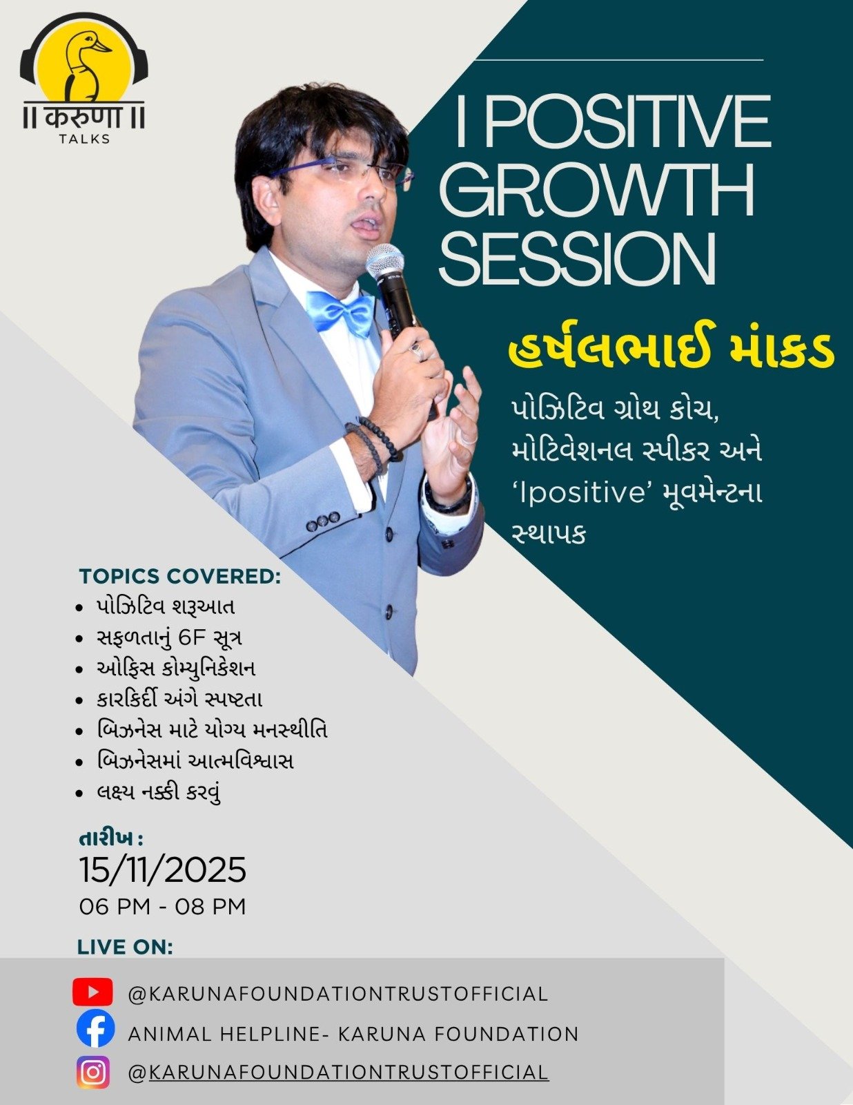 કરુણા ફાઉન્ડેશન ટ્રસ્ટ દ્વારા શનિવારે “Ipositive” વિષય પર ગ્રોથ સેશન, જે કરુણા ફાઉન્ડેશન ટ્રસ્ટના ઓનલાઇન પ્લેટફોર્મ પર લાઇવપ્રસારણ