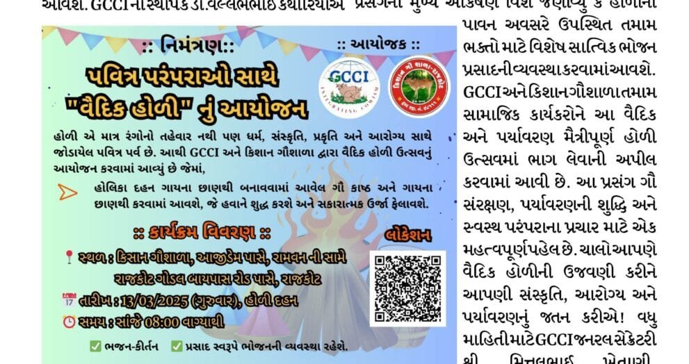વૈદિક હોળીની ઉજવણી કરીને આપણી સંસ્કૃતિ, આરોગ્ય અને પર્યાવરણને બચાવીએ ! – ડો.વલ્લભભાઈ કથીરિયા GCCI (ગ્લોબલ કન્ફેડરેશન ઓફ કાઉ બેઝ્ડ ઈન્ડસ્ટ્રીઝ) અને કિશાન ગૌશાળાના સંયુક્ત ઉપક્રમે પર્યાવરણની જાળવણી અને સાશ્વત પરંપરાઓને પુનર્જીવિત કરવા માટે આ વર્ષે “વૈદિક હોળી”નું તા. 13 માર્ચ 2025 (ગુરુવાર)ના રોજ રાત્રે 08:00 કલાકે કિસાન ગૌશાળા, આજી ડેમ પાસે, રામવન સામે, રાજકોટ […]