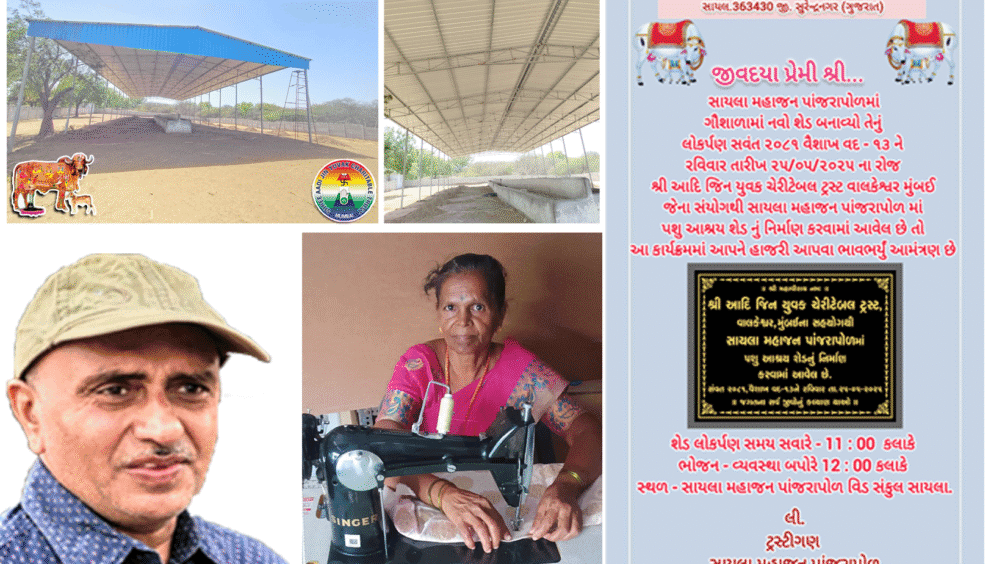 શ્રી આદિ જિન યુવક ચેરીટેબલટ્રસ્ટ (વાલકેશ્વર, મુંબઈ)ના સહયોગથી સાયલા મહાજન પાંજરાપોળમાં પશુ આશ્રય શેડનું લોકાપર્ણ કરાશે.
