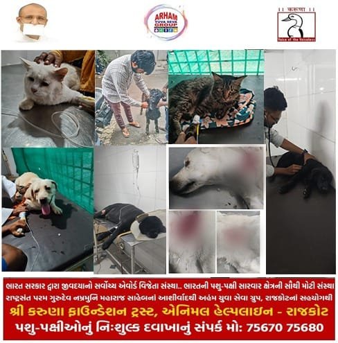 રાજકોટમાં છેલ્લા 21 વર્ષથી એનીમલ હેલ્પલાઇન કાર્યરત છે. રસ્તે રઝળતા, નીરાધાર, બિમાર પશુઓ, રેલવે ટ્રેકમાં ઘવાયેલી ગાયો, રોડ અકસ્માતમાં ઘવાયેલા નાના મોટા પશુ-પંખીઓને વિનામુલ્યે ઓપરેશન સહિતની સારવાર આપવામાં આવી છે. છેલ્લા 21 વર્ષથી કરૂણા ફાઉન્ડેશન દ્વારા મુંગા, બિનવારસી પશુ–પક્ષીઓની વિનામૂલ્યે સારવાર કરતું ‘મોબાઇલ પશુ ચિકિત્સાલય’,’એનિમલ હેલ્પલાઇન અને વેટરનરી હોસ્પિટલ’ સ્વરૂપે સેવારત કરાયું છે. અનેક સુવિધાઓથી સજજ પશુ દવાખાનામાં પશુ-પક્ષીઓ માટે ICU અને વેન્ટિલેટરનીસુવિધા, Critical case માટે તમામ પ્રકારના લોહીના, લીવર–કીડનીના રીપોર્ટની સુવિધા, પશુ અને પક્ષીઓની બ્લડલેસ આધુનિક મશીનો દ્વારા સર્જરી, પશુ-પક્ષીમાં તૂટેલા હાડકાના પ્લેટિન્ગના, પથરીના, પેટ અને આંતરડા, આંખ, કેન્સર વગેરેના ઓપરેશન, પશુઓ માટે ECG, Bp, Spo2 ની આધુનીક મશીન વડે તપાસની સુવિધા,પશુ-પક્ષીના તમામ પ્રકારના રોગો માટેની સારવાર, પશુ-પક્ષીઓને તમામ પ્રકારની રસી આપવાની સુવિધા અને પશુ-પક્ષીઓની જાળવણી, માવજત, ખોરાક સંબંધી માર્ગદર્શન વિગેરે પ્રકારની અતિ આધુનિક તમામ પ્રકારની સારવાર દવાખાનામાં નિઃશુલ્ક આપવામાં આવે છે. સમગ્ર ભારતની નિઃશુલ્ક પશુ-પક્ષી સારવાર ક્ષેત્રે ભારતની સૌથી મોટી સંસ્થા, ભારત સરકાર દ્વારા જીવદયાનો સર્વોચ્ચ એવોર્ડ વિજેતા સંસ્થા કરૂણા ફાઉન્ડેશન ટ્રસ્ટ—એનીમલ હેલ્પલાઈન, રાજકોટના દવાખાનામાં અત્યાર સુધીમાં 13 લાખ જેટલા બિનવારસી પશુ-પક્ષીઓની સ્થળ ઉપર જ, વિનામૂલ્યે,નિષ્ણાંત ડોકટરોની ટીમ દ્વારા, 11 (અગિયાર) એમ્બ્યુલન્સ તેમજ ત્રણ બાઇક એમ્બયુલન્સ થકી ઓપરેશન સહિતની સારવાર થઈ છે, થતી રહે છે. દર માસે લગભગ 12000 જેટલા બિનવારસી પશુ-પક્ષીઓની નિષ્ણાંત પશુચિકીત્સકોની ટીમ દ્વારા, સ્થળ પર જ, વિના મૂલ્યે તેઓ સાજા થાય ત્યાં સુધીની સઘન–સારવાર કરવામાં આવે છે. બીમાર અને અશકત, અકસ્માતથી ઘવાયેલ પશુ–પક્ષીઓને ગૌશાળા/પાંજરાપોળ/ સંસ્થાની જ નિઃશૂલ્ક વેટરનરી હોસ્પિટલમાં દાખલ કરવા માટેની વ્યવસ્થા કરવામાં આવે છે. ‘જીવદયા રથ’ દ્વારા દરરોજ પશુ, પક્ષીઓ તેમજ કીડી, ખિસકોલી જેવા જીવો સહિતનાં પશુઓની ભોજન વ્યવસ્થા કરવામાં આવે છે. રાષ્ટ્ર સંત પરમ ગુરુદેવ નમ્રમુનિ મહારાજ સાહેબનાં આશિર્વાદથી ‘અર્હમ યુવા સેવા ગ્રુપ’ અને ‘કરુણા ફાઉન્ડેશન ટ્રસ્ટ, એનિમલ હેલ્પલાઈન – રાજકોટ’નાં સથવારે નિ:શુલ્ક પશુ, પક્ષી સારવાર દવાખાનું શરુ કરવામાં આવ્યું છે. આ દવાખાનું શહેરનાં હાર્દ સમા વિસ્તાર તિરુપતિ નગર 1, હનુમાન મઢી ચોક પાસે આવેલ છે. દવાખાનામાં તમામ પશુ પક્ષીઓની નિ:શુલ્ક સારવાર કરવામાં આવે છે. અત્યાર સુધીમાં આ દવાખાનામાં 14343 થી વધારે પશુઓની સારવાર અને 439 મેજર ઓપરેશન થયેલા છે. પશુ દવાખાનાનો સમય સવારે 9 થી 1 અને સાંજે 4 થી 8 છે. (રવિવાર સિવાય) આ અંગે વધુ માહિત