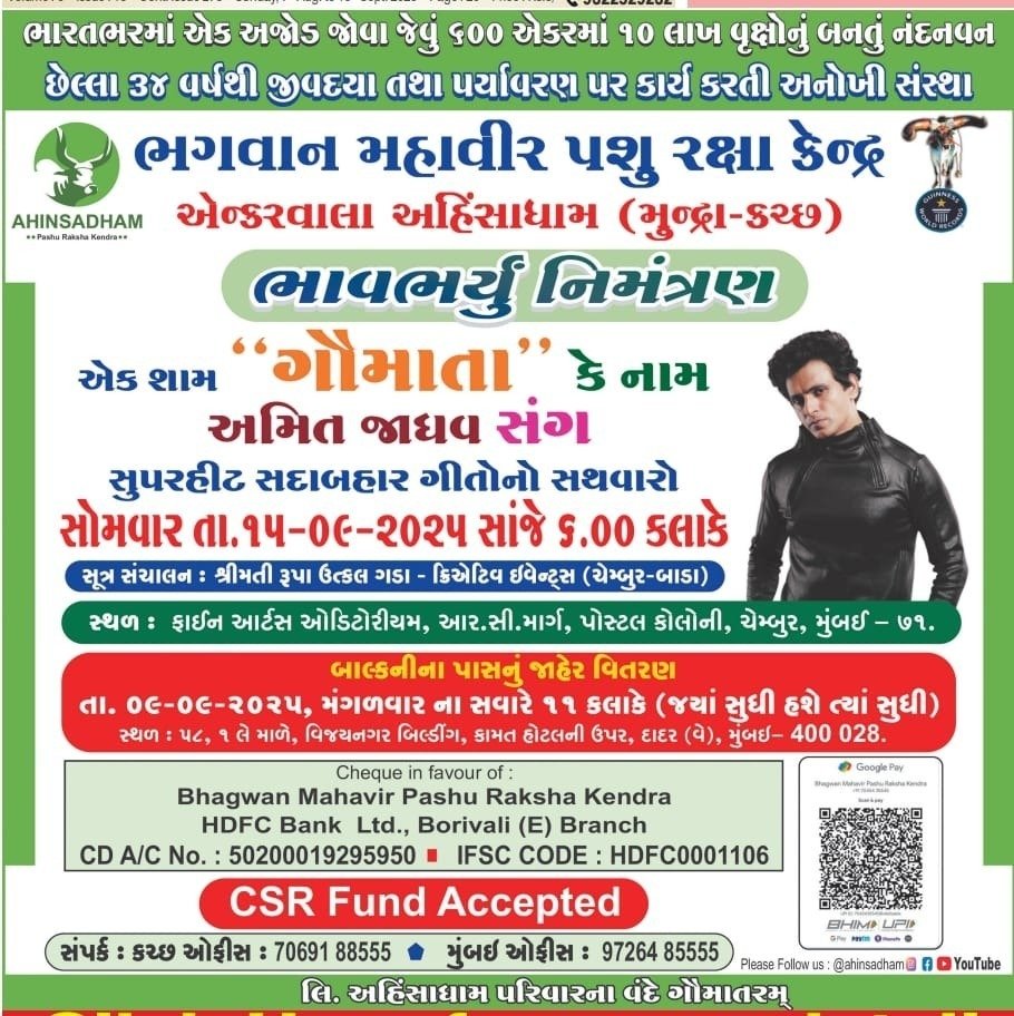 ભારતભરમાં એક અજોડ જોવા જેવું 600 એકરમાં 10 લાખ વૃક્ષોનું નંદનવન બની રહ્યું છે. જે છેલ્લા 34 વર્ષથી જીવદયા તથા પર્યાવરણ પર કાર્ય કરતી અનોખી સંસ્થા તથા 2900 થી વધુ અબોલ, અશક્ત, અપંગ, નિરાધાર, પશુ-પક્ષીઓને આશ્રય આપતું ધામ એટલે ભગવાન મહાવીર પશુ રક્ષા કેન્દ્ર, એન્કરવાલા અહિંસાધામ, કચ્છ-પ્રાગપુર ખાતે સ્થિત છે. આ સંસ્થા દ્વારા તા. 15, સપ્ટેમ્બર, સોમવારના રોજ સાંજે ૬–૦૦ કલાકેથી, ફાઈન આર્ટસ ઓડિટોરીયમ, આર.સી.માર્ગ, પોસ્ટલ કોલોની, ચેમ્બુર, મુંબઈ – 71 ખાતે ”એક શામ ગૌમાતા કે નામ” મ્યુઝીકલ નાઈટનું આયોજન કરવામાં આવ્યું છે. જે કાર્યક્રમમાં મુંબઈના સુપ્રસિધ્ધ કલાકાર અમિત જાધવ પોતાના સમધુર કંઠ દ્વારા શ્રોતાઓને મંત્રમુગ્ધ કરશે. કાર્યક્રમનું સૂત્ર સંચાલન શ્રીમતી રૂપા ઉત્કલ ગડા – ક્રિએટિવ ઇવેન્ટ્સ (ચેમ્બુર-બાડા) દ્વારા કરવામાં આવશે.
