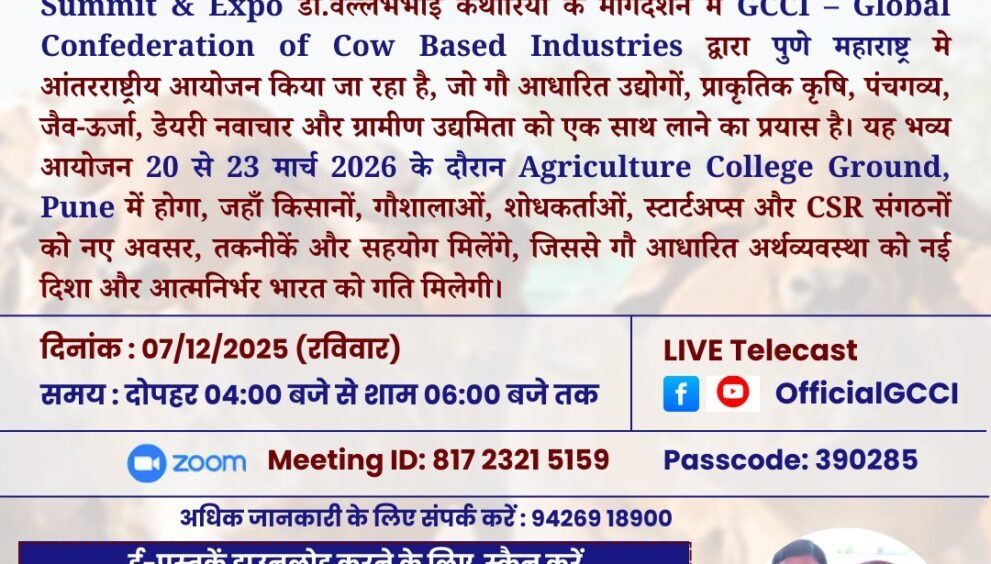 ગ્લોબલ કન્ફેડરેશન ઑફ કાઉ-બેઝ્ડ ઈન્ડસ્ટ્રીઝ (GCCI) દ્વારા મહારાષ્ટ્ર ની IT નગરી પુનામાં આગામી તારીખ 20 થી 23 માર્ચ, 2026 ના રોજ એગ્રીકલ્ચર કોલેજ ગ્રાઉન્ડ ખાતે “ગૌટેક 2026 કાઉ બેઝ્ડ ગ્લોબલ ઇન્વેસ્ટમેન્ટ સમીટ & એક્સપો”નું આયોજન કરવામાં આવી રહ્યું છે. ગૌ સેવા, ટેકનોલોજી, સ્ટાર્ટઅપ્સ, પ્રાકૃતિક ખેતી, પંચગવ્ય, બાયો–એનર્જી, ગોબર આધારિત પ્રોડક્ટ્સ અને A2 દૂધના વેલ્યુ એડીશન જેવા અનેક ક્ષેત્રોમાં કાર્યરત ગૌ મહાનુભાવો સાથે આયોજન બાબતે રાષ્ટ્રીય કામધેનુ આયોગના પૂર્વ અધ્યક્ષ અને GCCI ના ફાઉન્ડર ચેરમેન ડૉ. વલ્લભભાઈ કથીરિયાના માર્ગદર્શન હેઠળ GCCI દ્વારા તારીખ 07/12/2025, રવિવાર ના રોજ સાંજે 04:00 થી 06:00 વાગ્યા સુધી વિશેષ ઝૂમ મીટીંગનું આયોજન કરવામાં આવ્યું છે.
