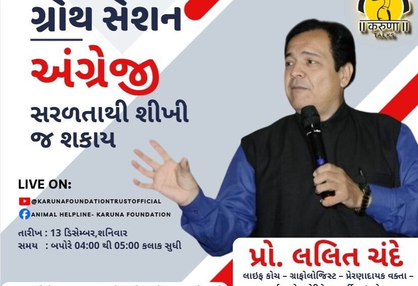 શ્રી કરુણા ફાઉન્ડેશન ટ્રસ્ટ દ્વારા પ્રોફેસર લલિતભાઈ ચંદેના ઓનલાઈન “અંગ્રેજી સરળતાથી શીખી જ શકાય” વિષય પર ટ્રેનિંગ સેશનનું તા.13 ડિસેમ્બર, શનિવારના રોજ બપોરે 04:00 વાગ્યેથી 05:00 કલાક સુધી નિઃશુલ્ક આયોજન