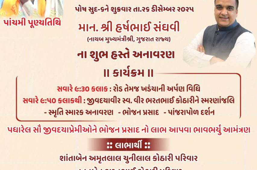 શ્રી રાજપુર ડીસા પાંજરાપોળ દ્વારા સ્વ. વીર ભરતભાઈ કોઠારીની સ્મૃતિમાં આયોજિત જીવદયા દિવસ નિમિત્તે તેમની પાંચમી પૂણ્યતિથિના અવસરે ભવ્ય સ્મૃતિ સ્મારક અનાવરણ સમારોહનું આયોજન કરવામાં આવ્યું છે. આ કાર્યક્રમ તા. 26 ડિસેમ્બર શુક્રવાર 2025ના રોજ શ્રી રાજપુર ડીસા પાંજરાપોળ, ચિત્રાસણી રોડ, કાંટ, ડીસા ખાતે યોજાશે. આ જીવદયા દિવસ નિમિત્તે ગુજરાત રાજ્યના માનનીય નાયબ મુખ્યમંત્રી હર્ષભાઈ સંઘવીના શુભ હસ્તે સ્મૃતિ સ્મારકનું અનાવરણ કરવામાં આવશે.