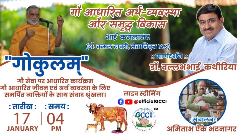 ગૌ કુલમ વિશેષ સંવાદ સિરીઝ ગૌ સેવા, ગૌ આધારિત અર્થતંત્ર અને ભારતીય મૂલ્યોના પુનર્જાગરણની દિશામાં એક મહત્વપૂર્ણ પહેલ છે, જે સમાજમાં સકારાત્મક પરિવર્તન અને આત્મનિર્ભર ભારતના નિર્માણને વેગ આપશે. રાષ્ટ્રીય કામધેનુ આયોગના પૂર્વ અધ્યક્ષ અને GCCI ના ફાઉન્ડર ચેરમેન ડો.વલ્લભભાઈ કથીરિયાના માર્ગદર્શન હેઠળ GCCI દ્વારા ગૌ આધારિત અર્થવ્યવસ્થા ને વેગ આપવા “ગૌ આધારિત અર્થ વ્યવસ્થા અને સમૃધ્ધ વિકાસ” વિષય પર ભારત સરકારના પૂર્વ સચિવ અને ગૌ આધારિત જીવનશૈલીના સમર્થક ભાઈ કમલાનંદજી (ડૉ. કમલ ટાઉરી નિવૃત્ત IAS) સાથે વિશેષ સંવાદનું તા.૧૭ -૦૧-૨૦૨૬, શનિવાર ના રોજ બપોરે ૦૪:૦૦ કલાકે વિશેષ સંવાદનું આયોજન કરવામાં આવ્યું છે.