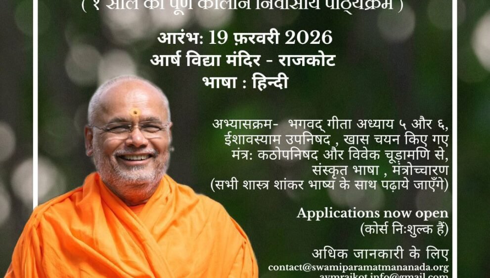 આર્ષ વિદ્યા મંદિર, રાજકોટ દ્વારા આધ્યાત્મિક જ્ઞાન ફેલાવવા માટે “વેદાંત અભ્યાસ કોર્સ” શરૂ કરવામાં આવી રહ્યો છે. આ 12 મહિના ચાલનારો સંપૂર્ણ સમયનો અભ્યાસક્રમ તા.19 ફેબ્રુઆરી 2026 ગુરુવારથી શરૂ થશે. આ કોર્સ સંપૂર્ણપણે નિઃશુલ્ક રહેશે અને તેનો સંપૂર્ણ અભ્યાસ હિન્દી ભાષામાં આપવામાં આવશે.