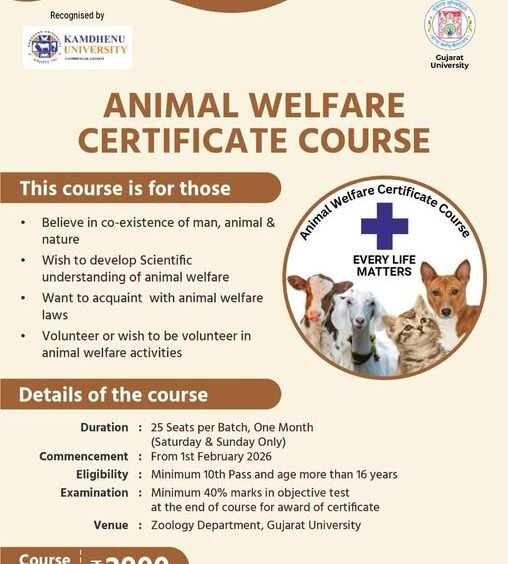 જીવદયા ચેરિટેબલ ટ્રસ્ટ અમદાવાદ દ્વારા તા.1 ફેબ્રુઅરી 2026થી પશુ કલ્યાણ કોર્સનું આયોજન