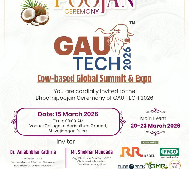 ગૌ આધારિત ઉદ્યોગો, સંશોધન, કૃષિ, પરંપરાગત જ્ઞાન અને નવીન ટેક્નોલોજીને વૈશ્વિક મંચ પૂરો પાડવાના હેતુથી ગ્લોબલ કન્ફેડરેશન ઑફ કાઉ-બેઝ્ડ ઇન્ડસ્ટ્રીઝ (GCCI) દ્વારા “ગૌ ટેક 2026” નામનું આંતરરાષ્ટ્રીય શિખર સંમેલન અને પ્રદર્શનીનું આયોજન કરવામાં આવી રહ્યું છે. આ ભવ્ય આયોજનના પ્રારંભ રૂપે તા.15 માર્ચ, રવિવાર 2026ના રોજ સવારે 9:00 વાગ્યે એગ્રીકલ્ચર કોલેજ ગ્રાઉન્ડ, શિવાજીનગર, પુના (મહારાષ્ટ્ર) ખાતે “ગૌ ટેક 2026” નું ભૂમિ પૂજનનું આયોજન કરવામાં આવ્યું છે.