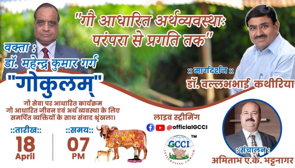 GCCI દ્વારા આયોજિત “ગૌકુલમ” વિશેષ સંવાદ સિરીઝમાં “ગૌ આધારિત અર્થવ્યવસ્થા: પરંપરા થી પ્રગતિ સુધી” વિષય પર વિશેષ સંવાદતા. 18-04-2026, શનિવાર સાંજે 07:00 વાગ્યે ગૌ આધારિત અર્થવ્યવસ્થા, પશુપાલન વ્યવસ્થાપન, બાયોગેસ અને કૃષિ સાથે સંકળાયેલા ડૉ. મહેન્દ્ર કુમાર ગર્ગ સાથે સંવાદ